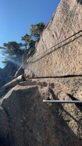 Looking out over the Maine shoreline before starting the climb Standing near the edge of a cliff, overlooking Acadia National Park Climbing upward with iron