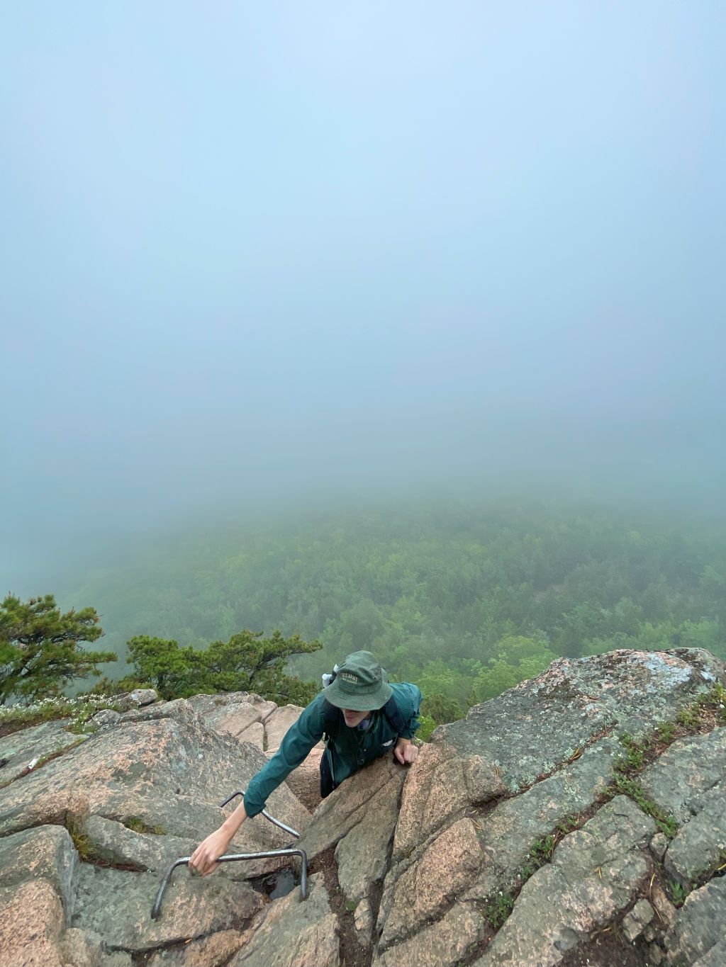 Me and the same friends climbing up the Beehive trail with a fog behind
