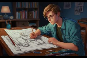 2). A picture of my character Alex, waking up from and lying on his bed looking at his drawing set. The drawing set he is looking at is next to the bed and looks like it hasn’t been used in a long time. There is dust on it.