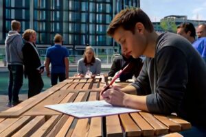 1) My character Alex is sitting on a bench and drawing. He is surrounded by people who are watching him.