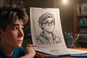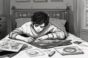 2). A picture of my character Alex, waking up from and lying on his bed looking at his drawing set. The drawing set he is looking at is next to the bed and looks like it hasn’t been used in a long time. There is dust on it.