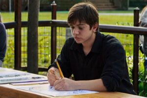 1) My character Alex is sitting on a bench and drawing. He is surrounded by people who are watching him.